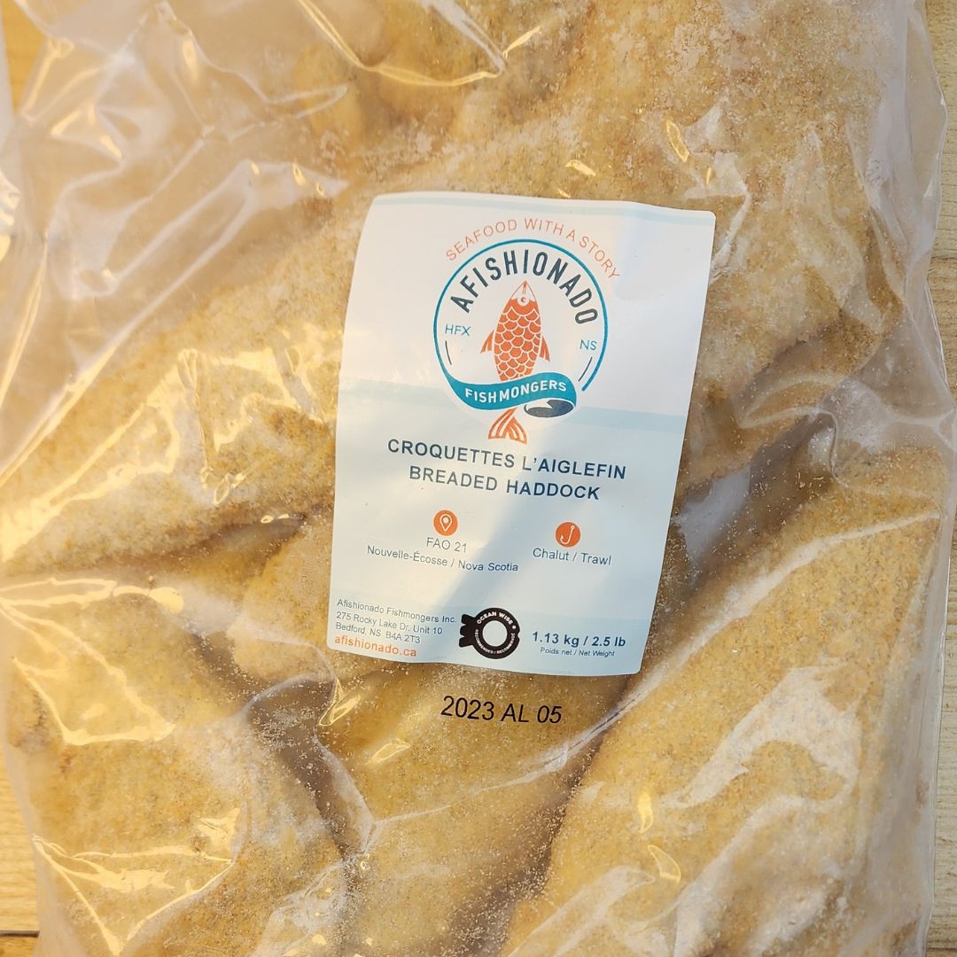 2.5 lb breaded haddock fillets. These Haddock are from Georges Bank, Nova Scotia in the FAO 21 fishing area. They are caught via trawl and come frozen. This product is Ocean Wise recommended.