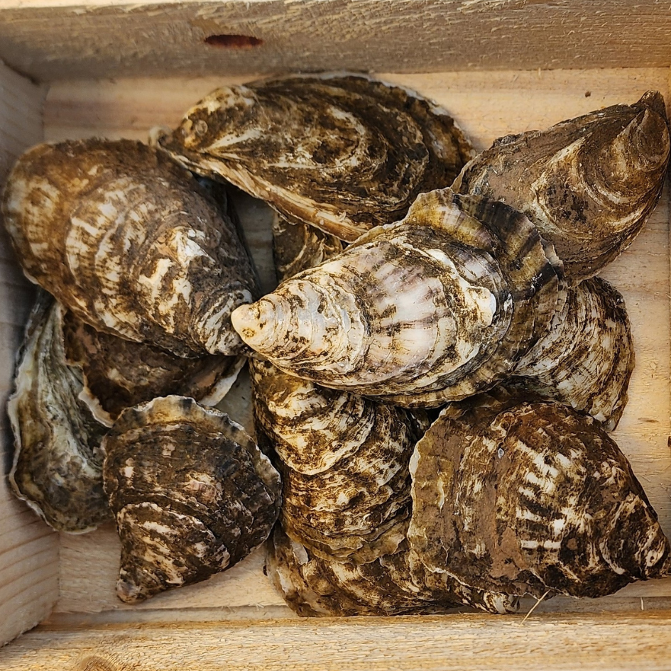 3-3.5" Little Shem Atlantic Oysters from Little Shemogue (Shem-O-gwi) Bay in Eastern New Brunswick. Plate-ready choice shape after 4 to 5 years of growing!